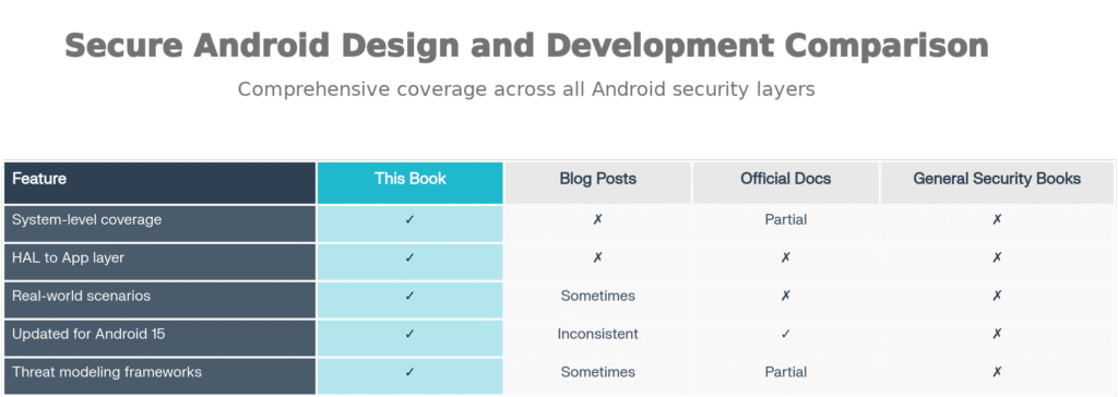 System-Level Security Insights — Deep understanding of security architecture from application layer to HAL. Most resources stop at the API. This book teaches you how to reason about security across the entire stack, from framework services to hardware abstraction layers.